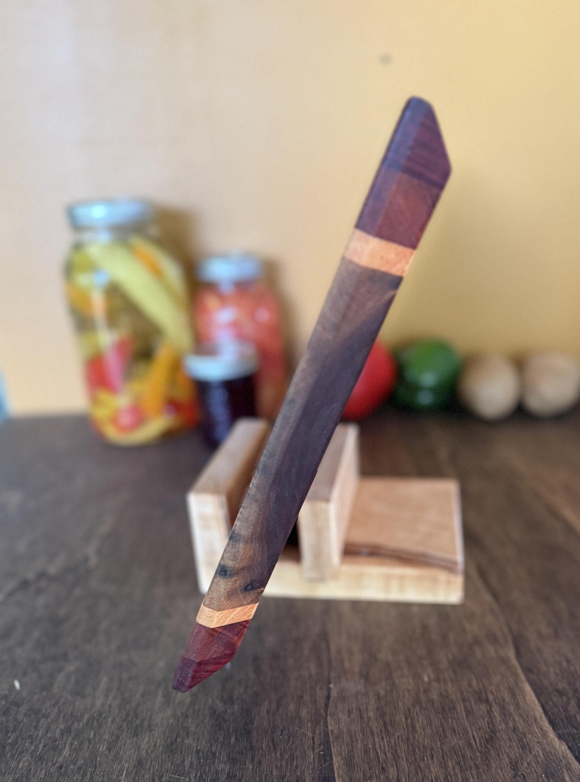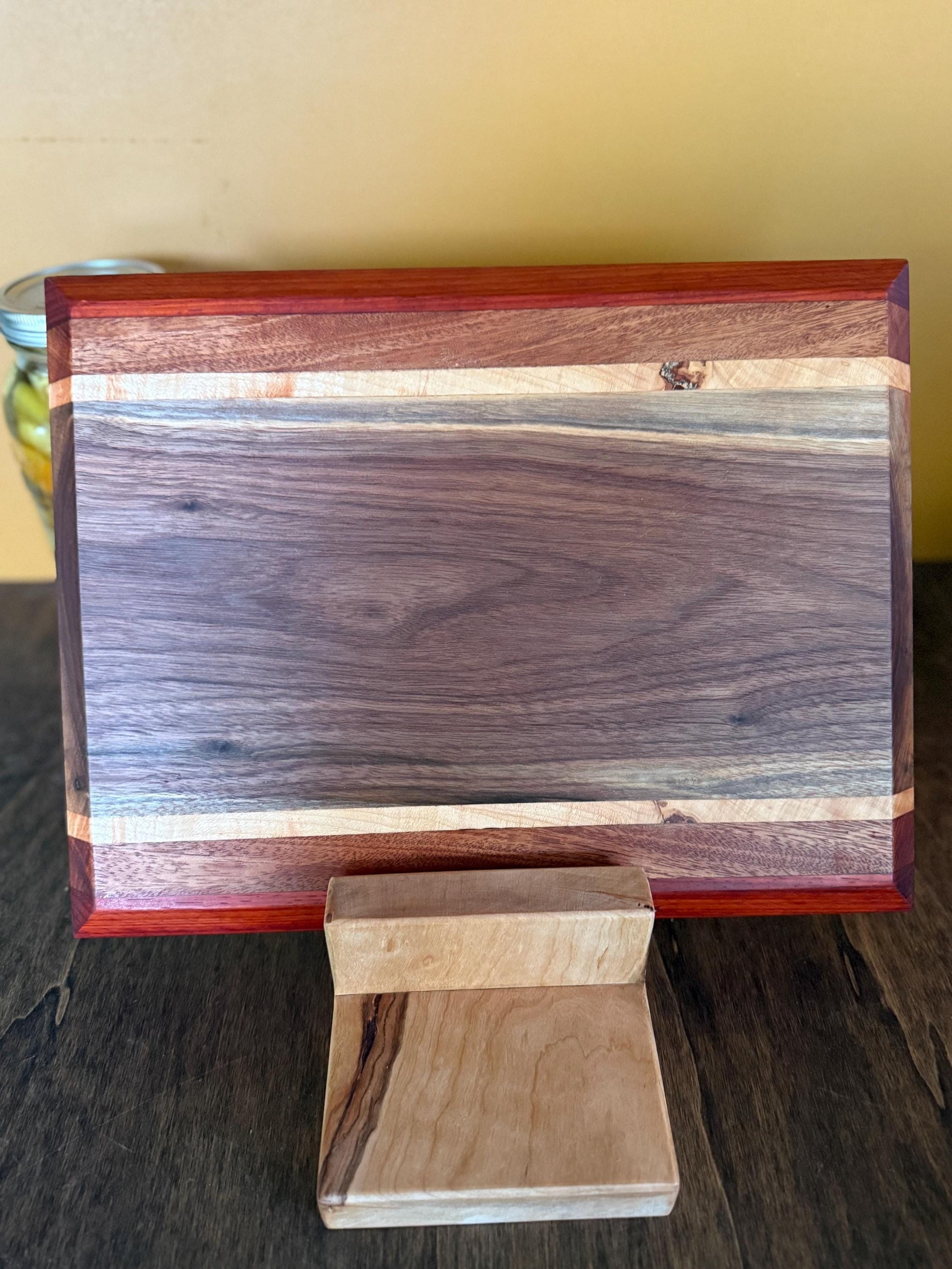 Add a touch of handcrafted charm to your kitchen with this striped cutting board. We make each item by hand in our small family workshop. From cutting and sanding to finishing — making each piece truly one of a kind. This board is made from premium Walnut, Maple, Sapele, and Padauk hardwoods, carefully joined to create a striking striped pattern that’s as durable as it is beautiful. This solid wood board is perfect for everyday use—whether chopping vegetables, slicing meats, or serving cheese and charcuterie.