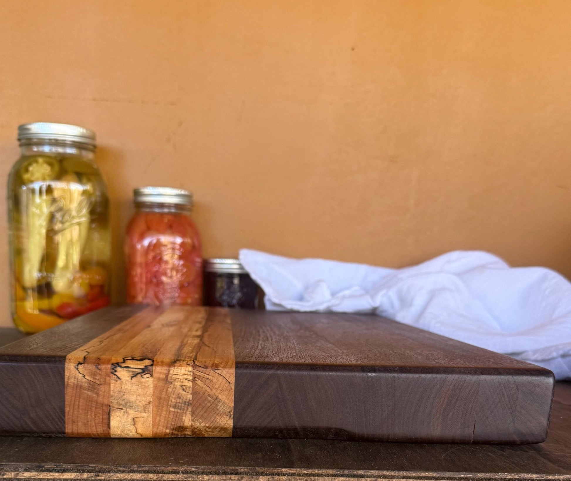 Woods used: Maple and Walnut Approximate size: 18.5" x 12” x 2” Weight: 2 pounds Finished with a food-safe mineral oil and beeswax blend Perfect for kitchen décor, wedding gifts, or housewarming presents Every board we make has its own unique wood grain pattern, so no two are exactly alike—making yours truly one of a kind.