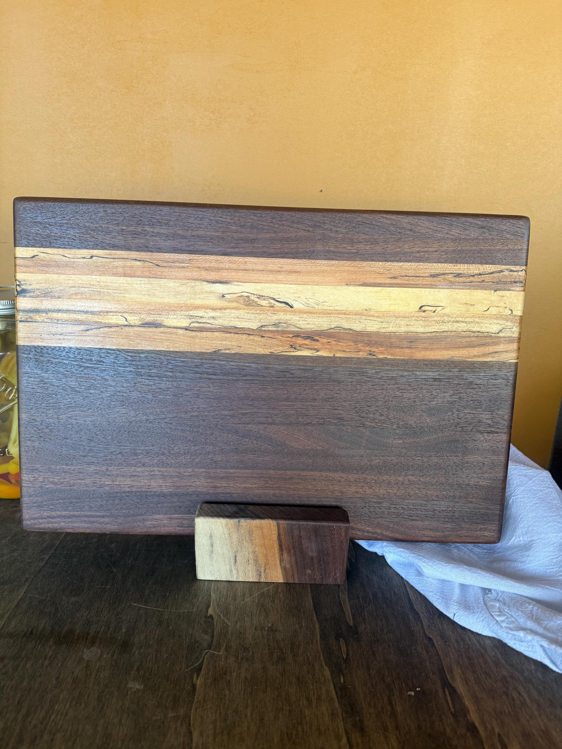 Add a touch of handcrafted charm to your kitchen with this heavy duty striped wooden cutting board. This durable cutting board weighs in at 12 pounds. We make each item by hand in our small family workshop. From cutting and sanding to finishing — making each piece truly one of a kind. This board is made from premium Maple and Walnut hardwoods, carefully joined to create a striking striped pattern that’s as durable as it is beautiful. This solid wood board is perfect for everyday use—whether chopping vegetables, slicing meats, or serving cheese and charcuterie.