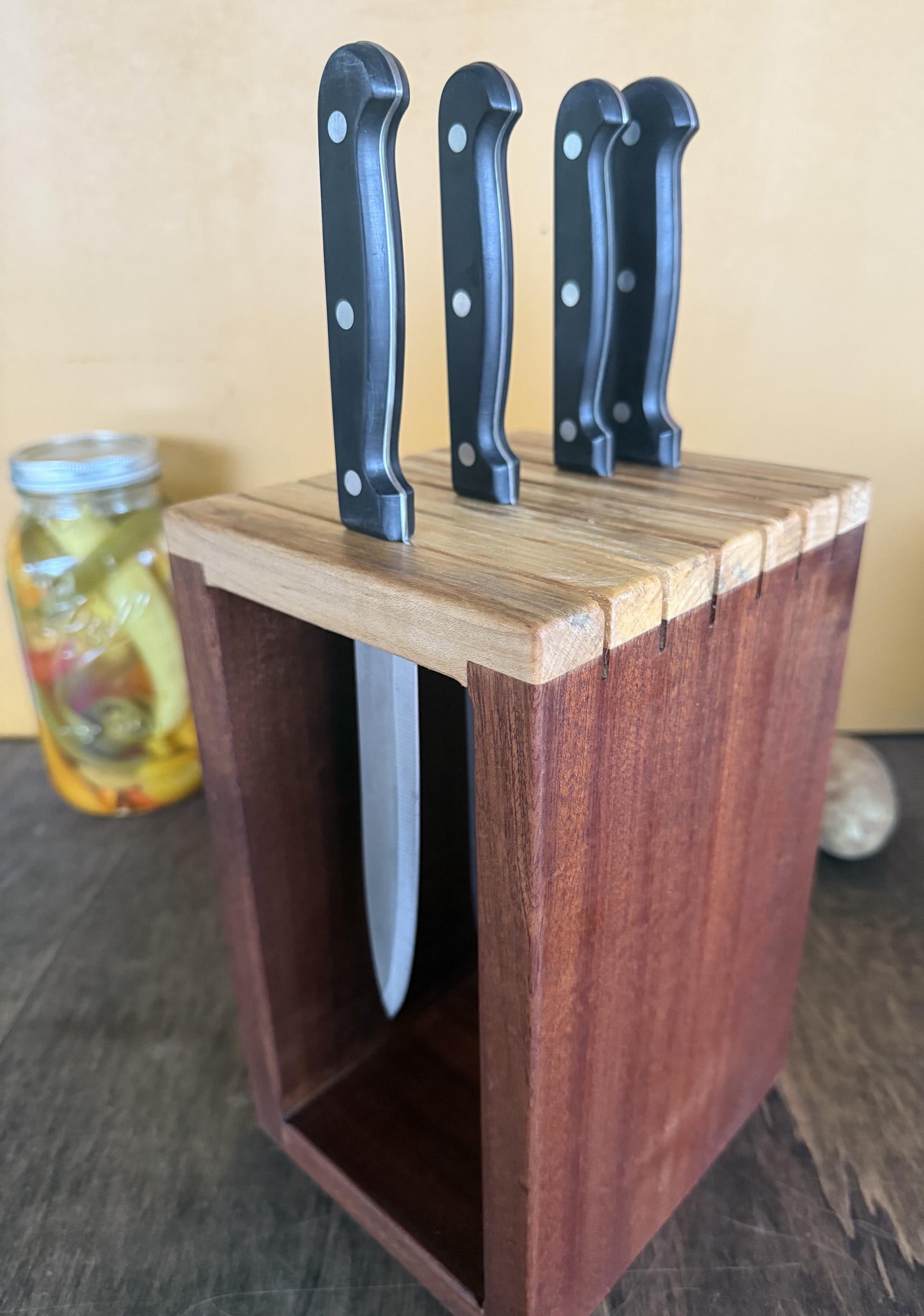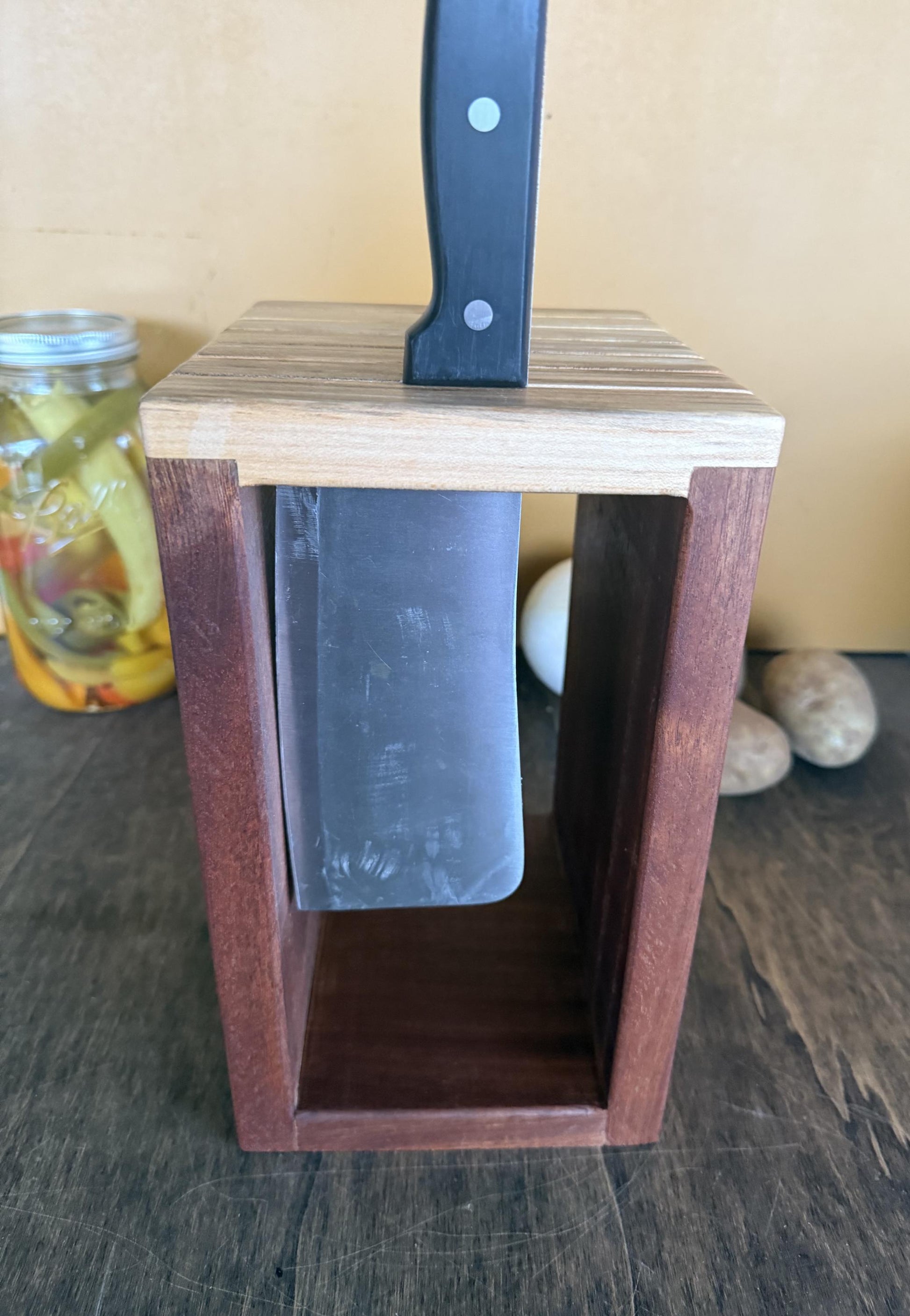 Bring a touch of rustic charm and personalization to your kitchen with this handcrafted sapele and maple knife holder. Each block is made from solid wood making it as beautiful as it is functional. Perfect for displaying your favorite knives, this piece combines natural elegance with practical design — a timeless addition to any kitchen decor. Whether it’s for your own home or as a thoughtful housewarming, wedding, or anniversary gift, this custom knife block will be treasured for years to come. Features: Handmade from sapele and maple Personalized engraving with your family name or message Holds standard kitchen knife sets (knives not included) Finished with a food-safe oil for a natural sheen and protection Made to order in our small family woodshop, Reid Rustic Woodworks Dimensions: 11” tall x 7” wide x 6” deep