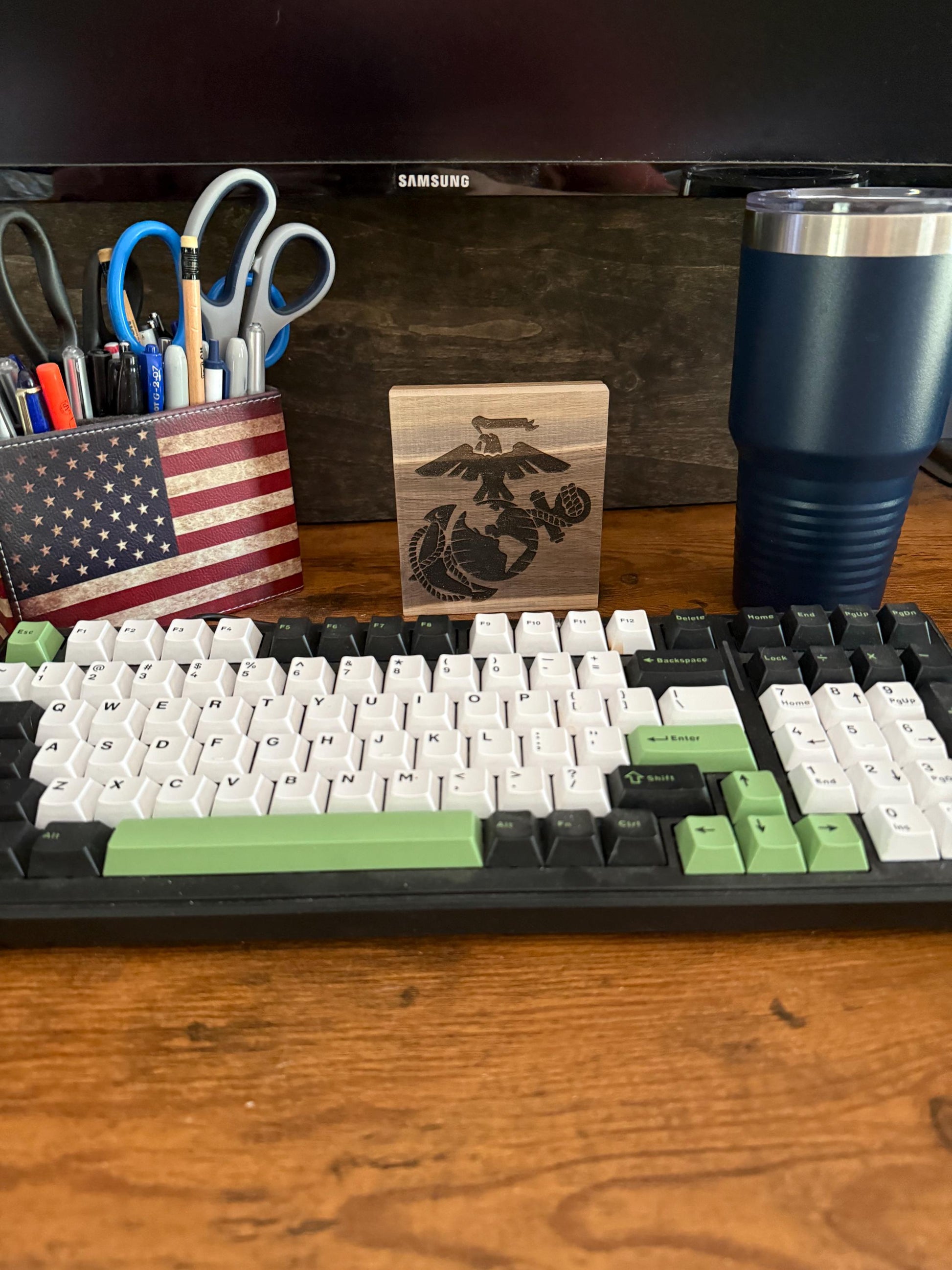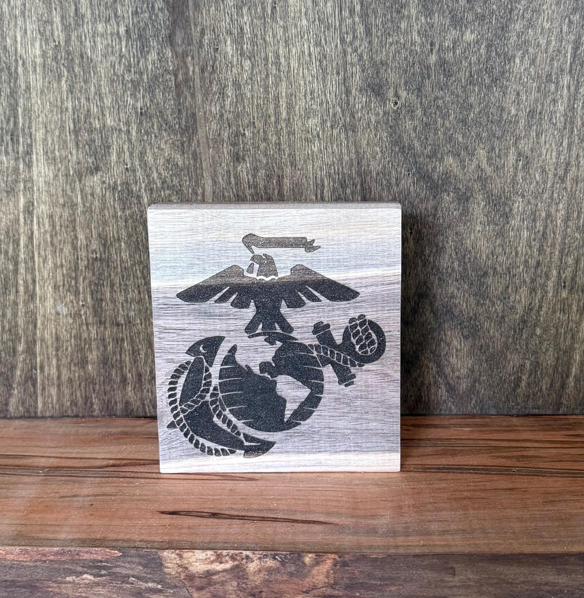 Honor your hero with a personalized military shelf sitter! Each rustic wood piece is handcrafted by us at Reid Rustic Woodworks and features the USMC logo — along with an optional engraved name, rank, or date to make it one-of-a-kind. These make thoughtful gifts for veterans, active-duty members, or proud military families. Perfect for desks, shelves, or mantels — a unique piece of patriotic home décor that shows pride and respect. Details: Approximate size: 4.50” H x 4.50” W x 1”. Freestanding (no hardware needed) Made from walnut wood — each piece will have its own beautiful grain pattern Laser engraved design for crisp detail and lasting quality.