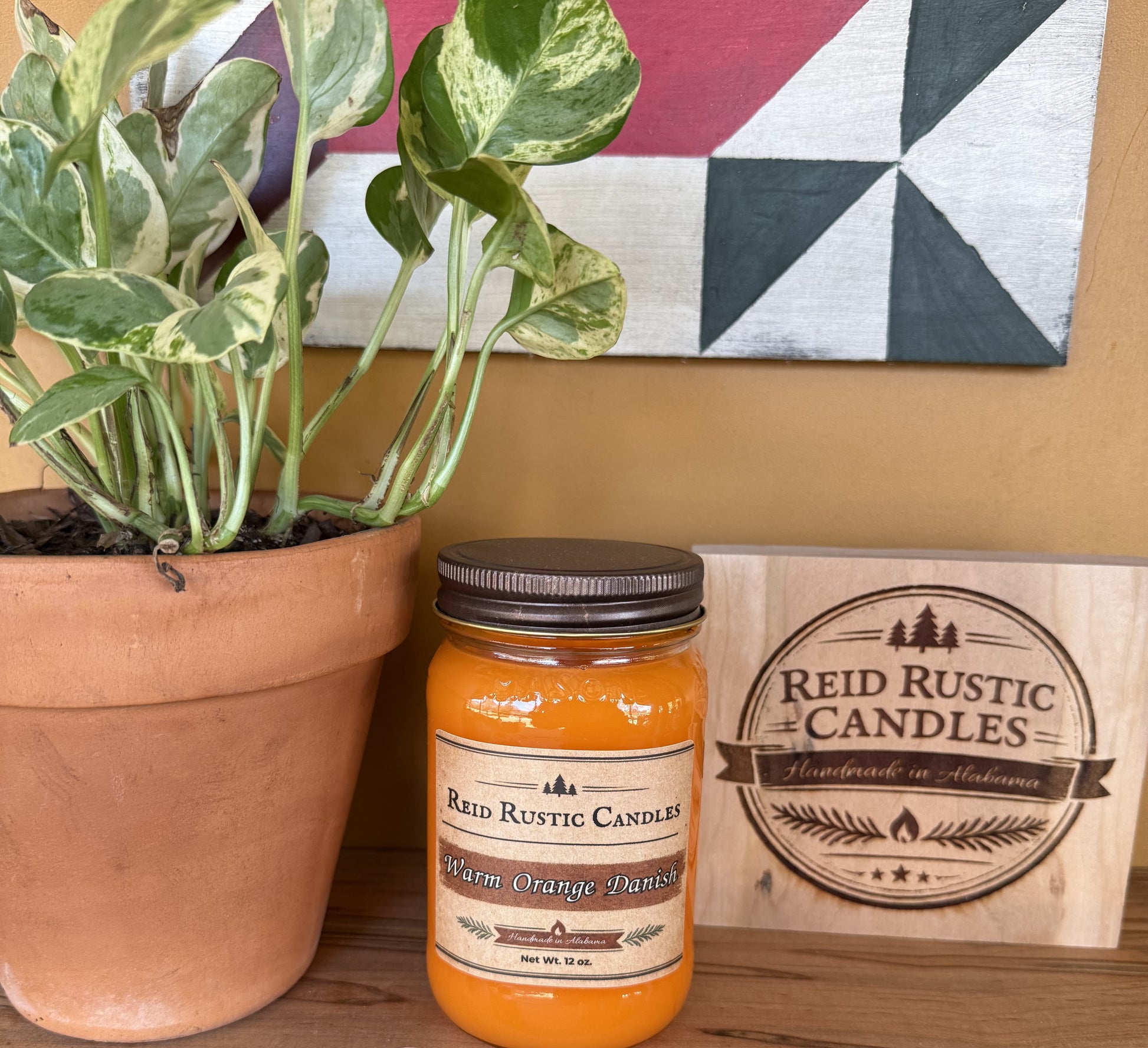 I hand-pour each 16 oz Warm Orange Danish candle right here in Alabama in small batches. It’s poured into a classic mason jar with a clean-burning cotton wick for that simple, honest farmhouse feel.